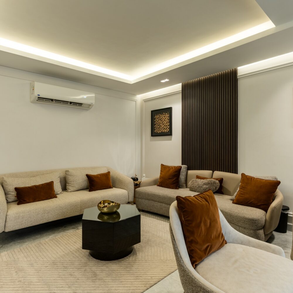 A bold entertainment wall featuring striking black marble veining, integrated storage, and refined décor elements—balancing luxury with modern functionality.