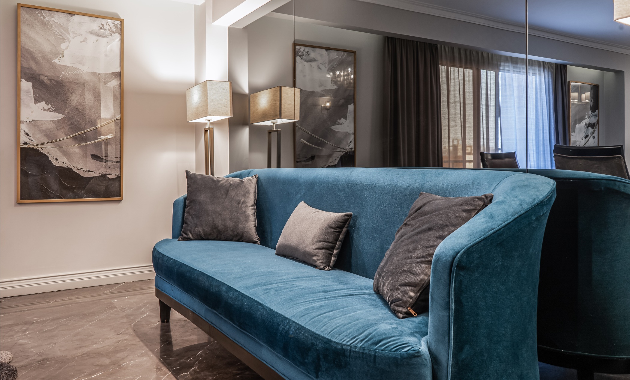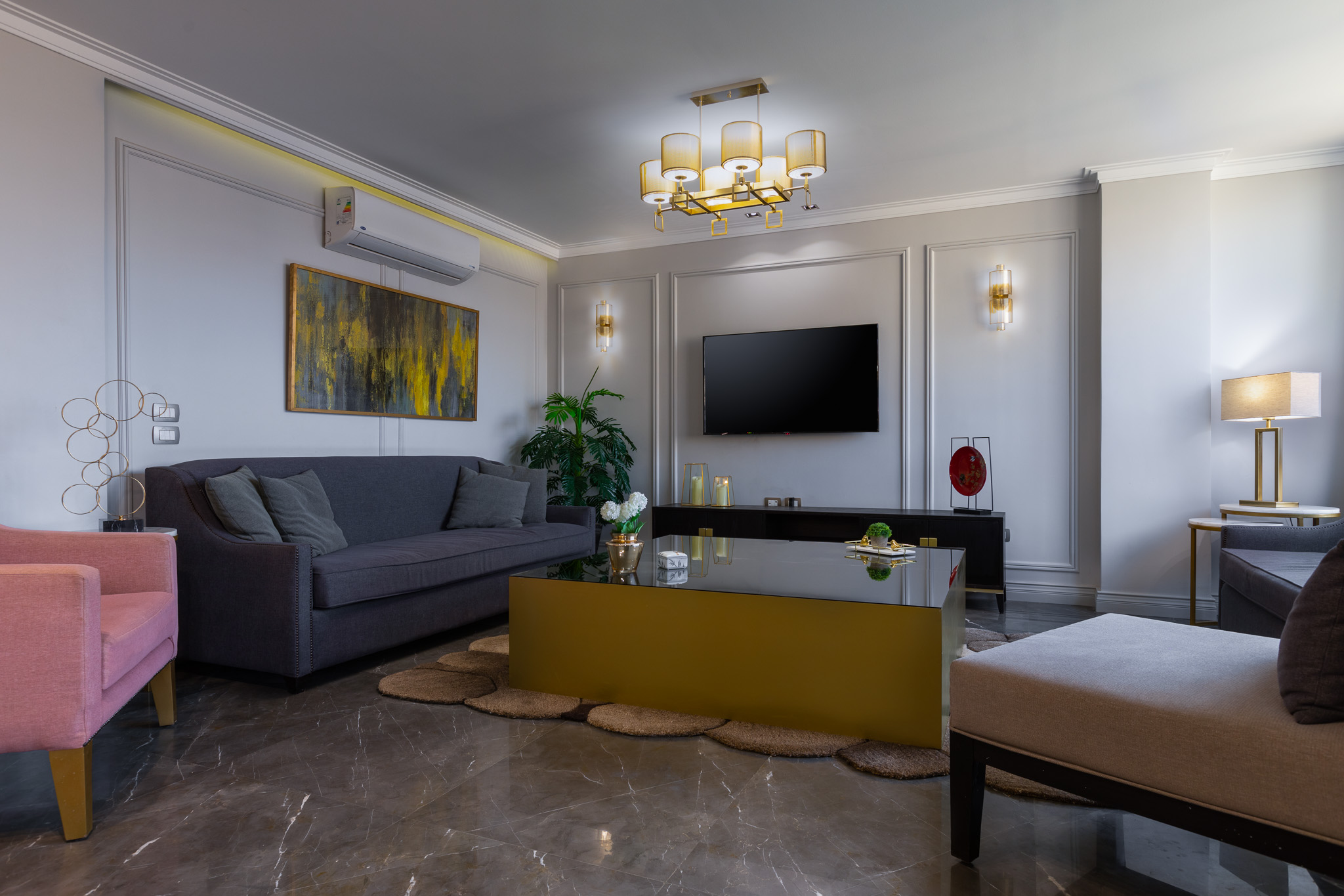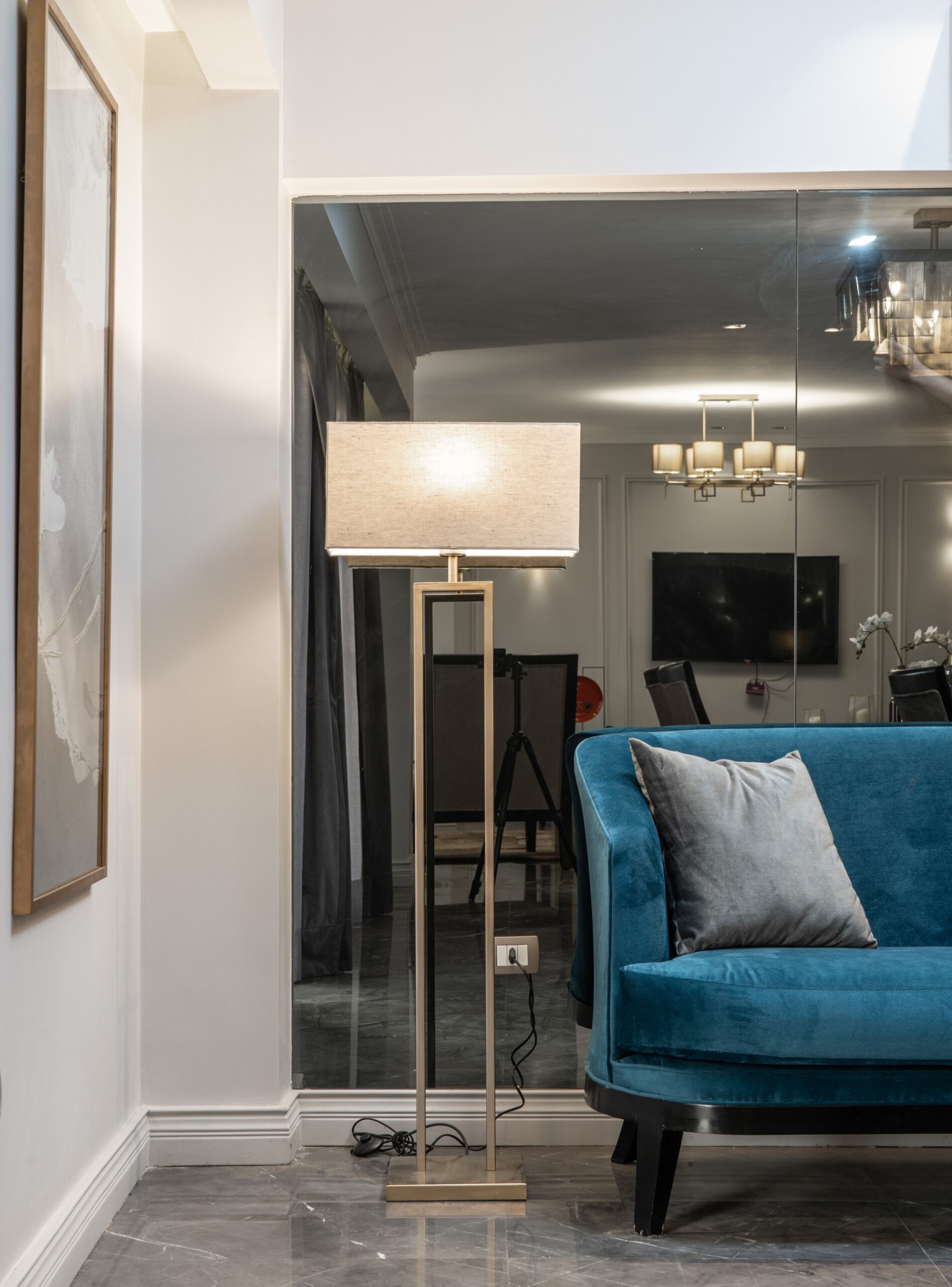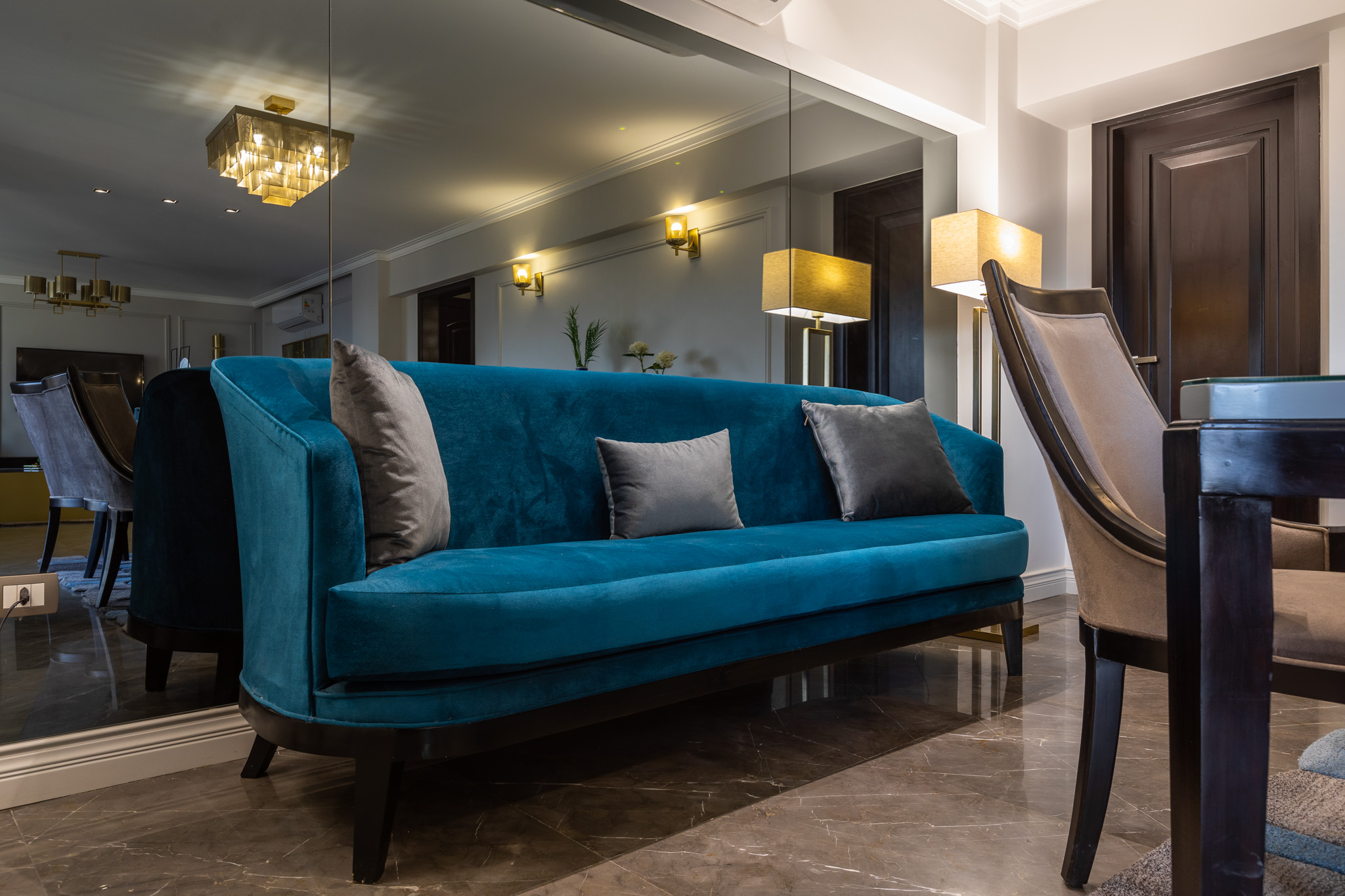 Experience modern living at its finest in this newly constructed residential apartment. The contemporary style and sleek design are perfectly complemented by a stunning teal accent sofa, adding a pop of color and personality to the space.