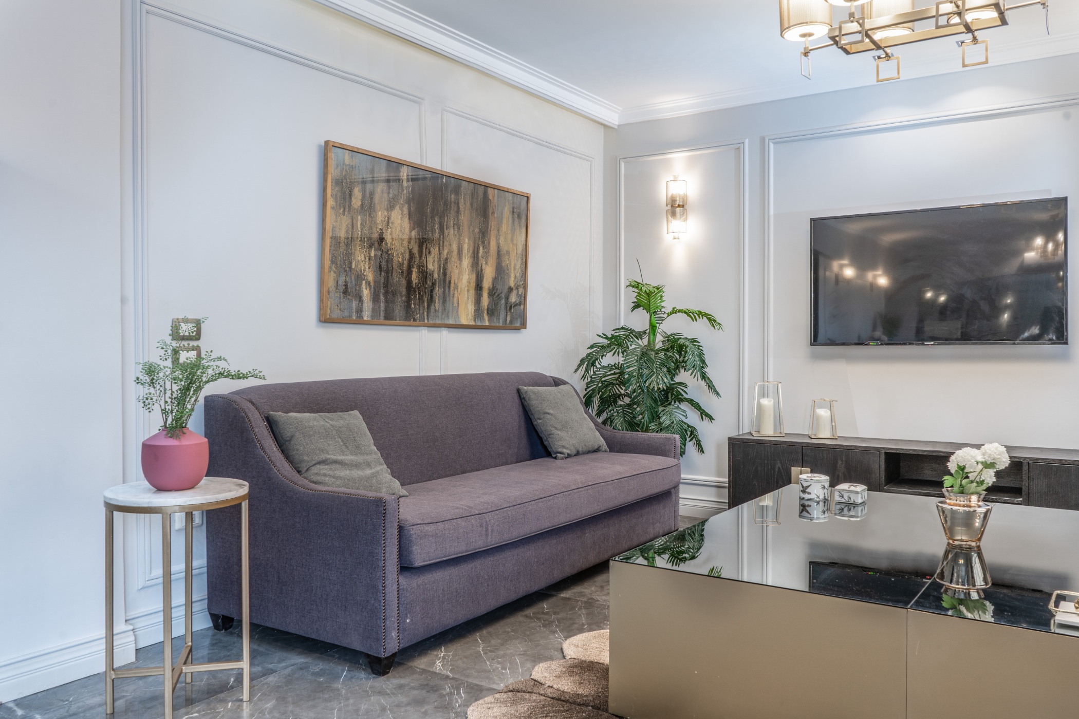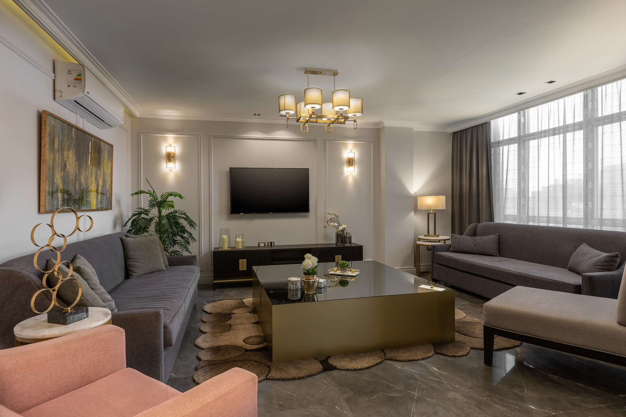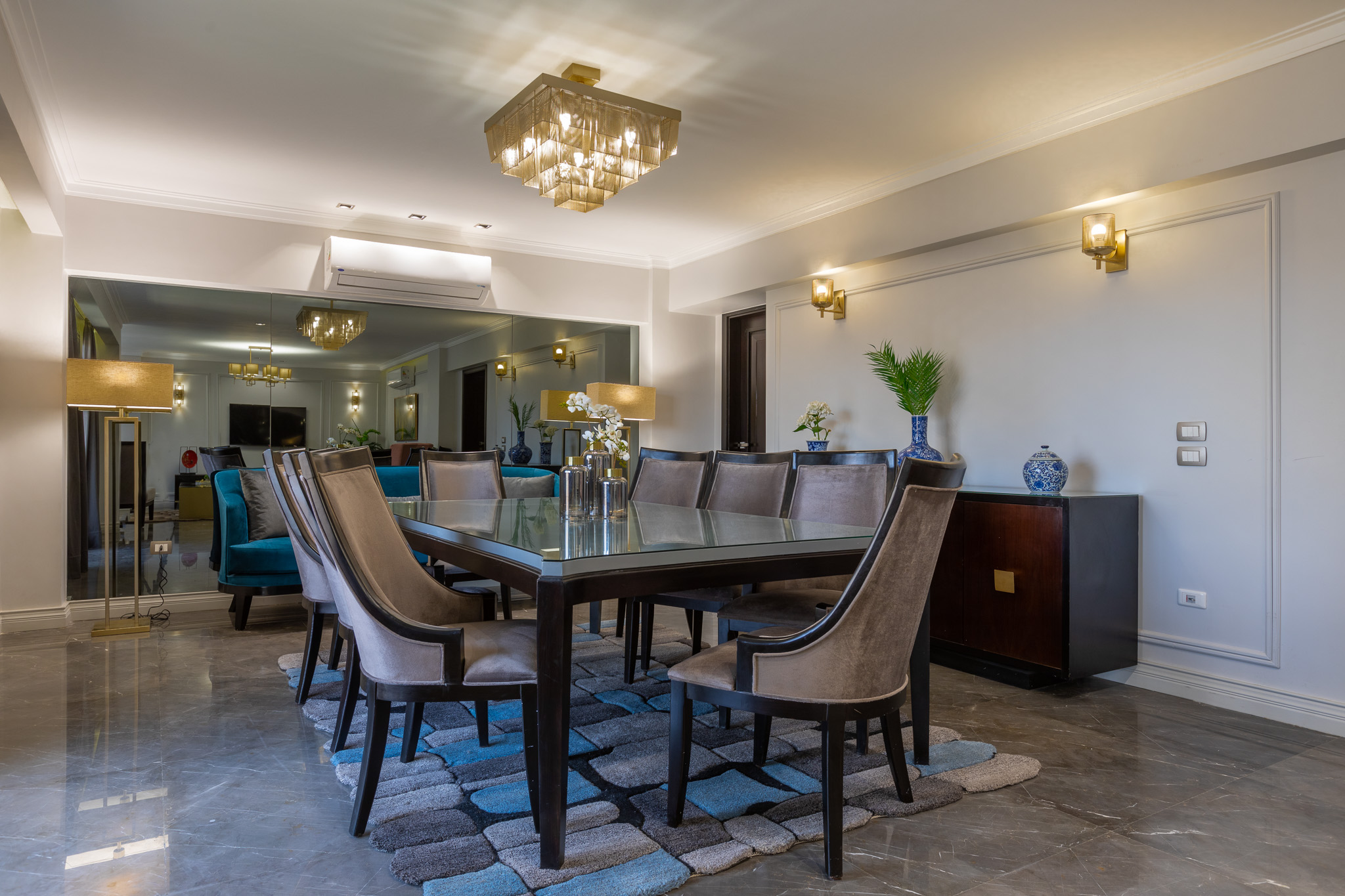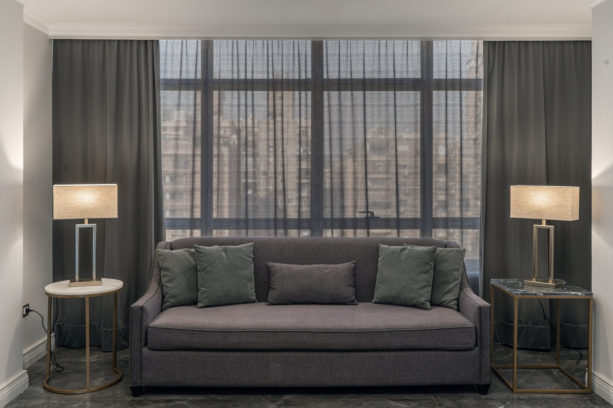 Experience modern living at its finest in this newly constructed residential apartment. The contemporary style and sleek design are perfectly complemented by a stunning teal accent sofa, adding a pop of color and personality to the space.